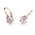 Dětské náušnice ve tvaru hvězdičky se zapínáním typu brizura jsou vyrobeny z růžového 14k zlata a osázené světle modrými kamínky. Tento typ zapínání považujeme za jeden z nejbezpečnějších a je nejvhodnější jako první náušnice pro miminko. Veškeré rozměry jsou podrobně rozkresleny v podpurné fotografii. Ke každým náušnicím je možné vybrat si i ladící přívěsek s řetízkem.